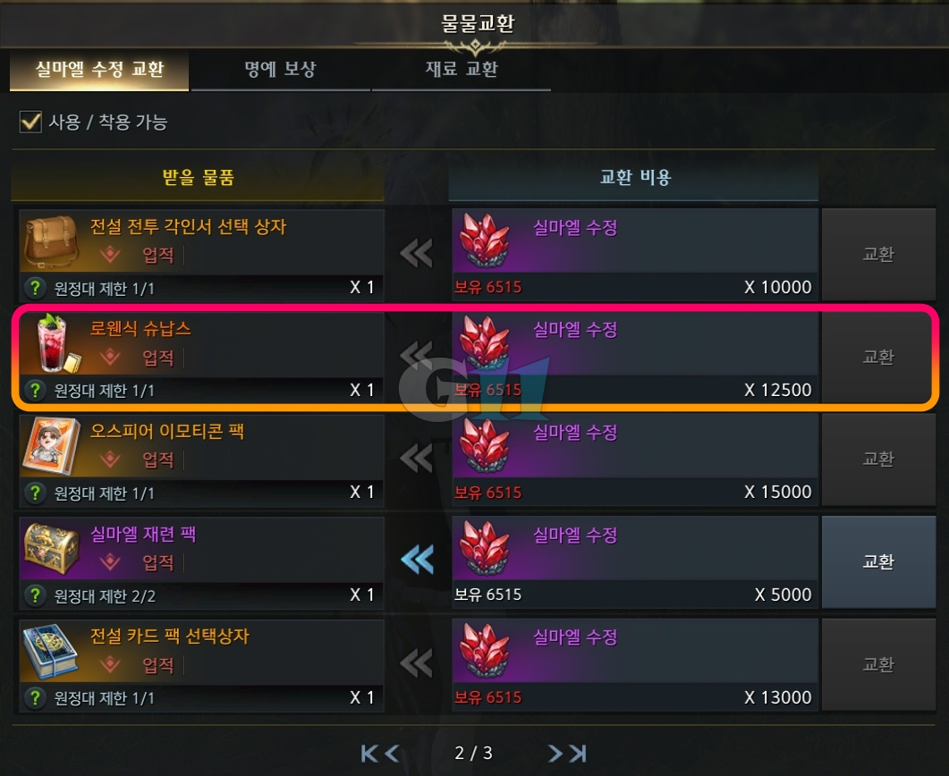 중립구역 엘리야베크에 있는 실마엘 수정 교환 제이슨 NPC에게 실마엘 수정 12,500개로 로웬식 슈납스 요리를 교환할 수 있습니다. 교환 조건은 세력전 직위 7단계를 달성해야 합니다.