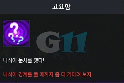 굴 앞에 서면 먼저 고요함 디버프 10초가 유지됩니다. 가만히 기다리면 고요함 디버프 지속시간이 줄어들며 0초가 되면 조용한 분주함 버프가 생깁니다. 조용한 분주함 버프 10초 유지 시 숲토끼가 출몰합니다. 이 때 수렵 스킬로 토끼를 잡으면 갈무리가 나타나고 갈무리 수확시 일정 확률로 숲토끼를 잡아 놓은 자루를 획득할 수 있습니다. 보통 20분~30분 정도 소요됩니다.