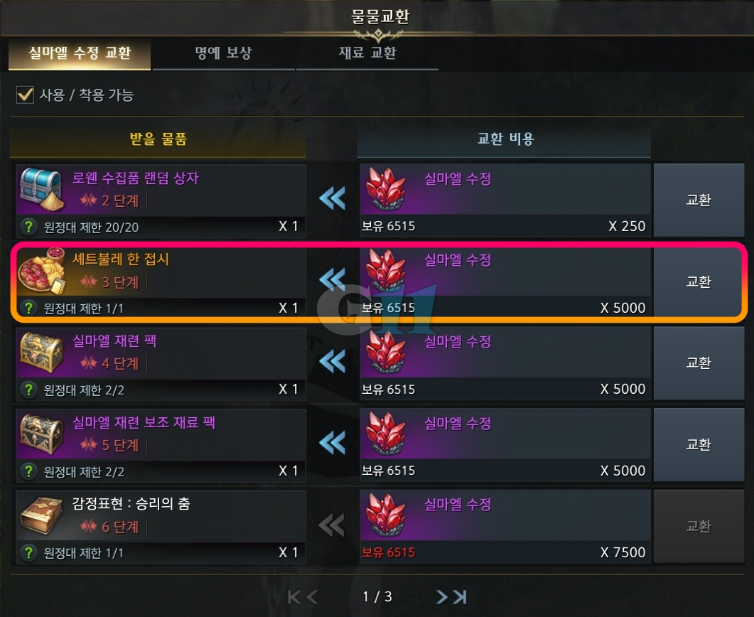 중립 구역 엘리야베크에 있는 실마엘 수정 교환 제이슨 NPC에게 실마엘 수정 5,000개로 셰트불레 한 접시 요리를 교환할 수 있습니다. 교환 조건은 세력 직위 3단계로 매일 8시 30분에 진행하는 [습격] 이벤트를 꾸준히 참가해야 합니다.