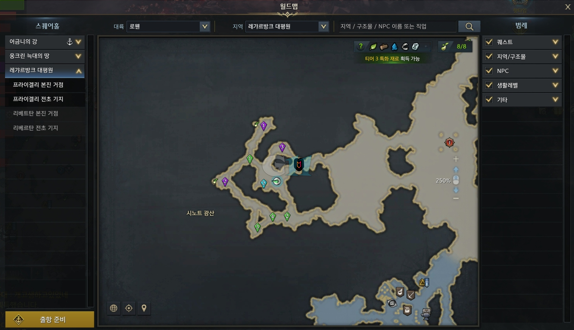 로아 로웬 대륙에서 수집품 파밍, 수집품 노가다를 하실 분들은 이 자리를 추천합니다. 공격대를 꾸리고 총 10명에서 젠 포인트마다 자리에 한 분씩 서서 포인트에 있는 몬스터만 처리합니다. 공격대 구성은 시너지 위주로 챙기셔도 되고 시노트 광산 입구 2곳에는 스펙이 높은 유저가 자리를 잡는 것이 좋습니다. 약 6~7분 파밍 한 바퀴를 돌면서 드롭된 수집품을 획득하고 다시 자리로 돌아오는 방식으로 진행했으며 후상대 진영과 마찰이 있을 경우 시간이 꽤나 소비되기 때문에 빠르게 채널을 변경해 피하면서 수집품을 모아 보세요.