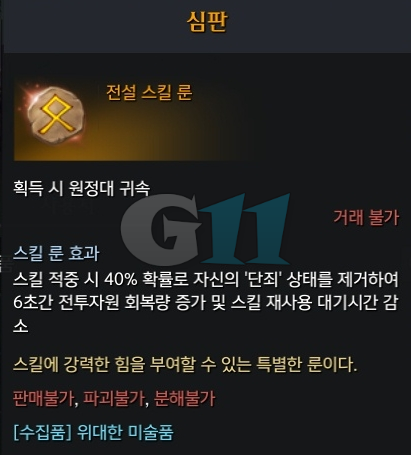 | 희귀 단죄 룬 | 스킬 적중 시 40% 확률로 자신에게 3초간 지속되는 '단죄' 상태를 부여하며 해당 상태 일 때 '심판'을 통해 추가 효과를 발동 |