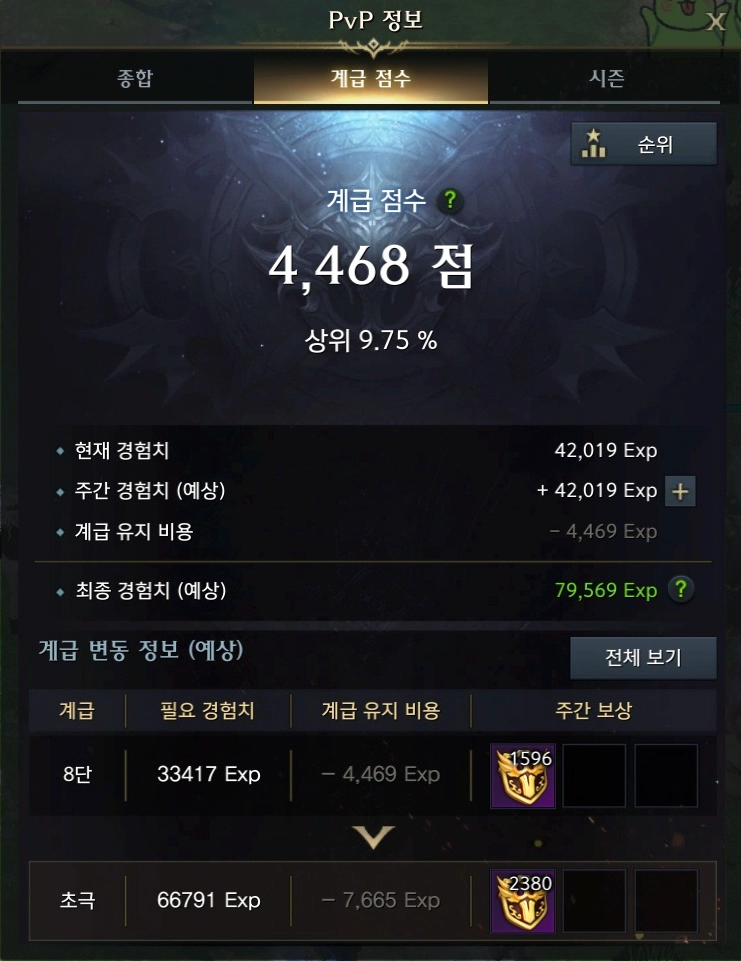 로스트아크 단축키 Alt+K를 누르면 내 PVP 정보를 확인할 수 있으며 현재 PVP 계급과 순위, 점수와 시즌 평점 등 관련된 다양한 정보를 확인할 수 있습니다. PVP 계급 점수를 올리는 방법과 계급 순서를 소개합니다. 사람마다 목표하는 계급이 있고 해당 계급을 달성하기 위한 조건은 위와 같습니다. 계급 올리기 위해 한 주 동안 열심히 했다면 최대 초극까지 달성할 수 있지만 백분위 0.1%로 200판 이상하는 유저이기에 보통은 5~9단 정도 달성하게 됩니다. PVP를 해도 점수가 오르지 않을 때, 점수가 안 오를 때가 있는데 서버에 반영이 되는데 시간이 걸리기 때문입니다. 보통 이 경우에 재접속을 하면 해결되고 핫타임일 경우 핫타임이 종료되면 데이터가 집계됩니다.