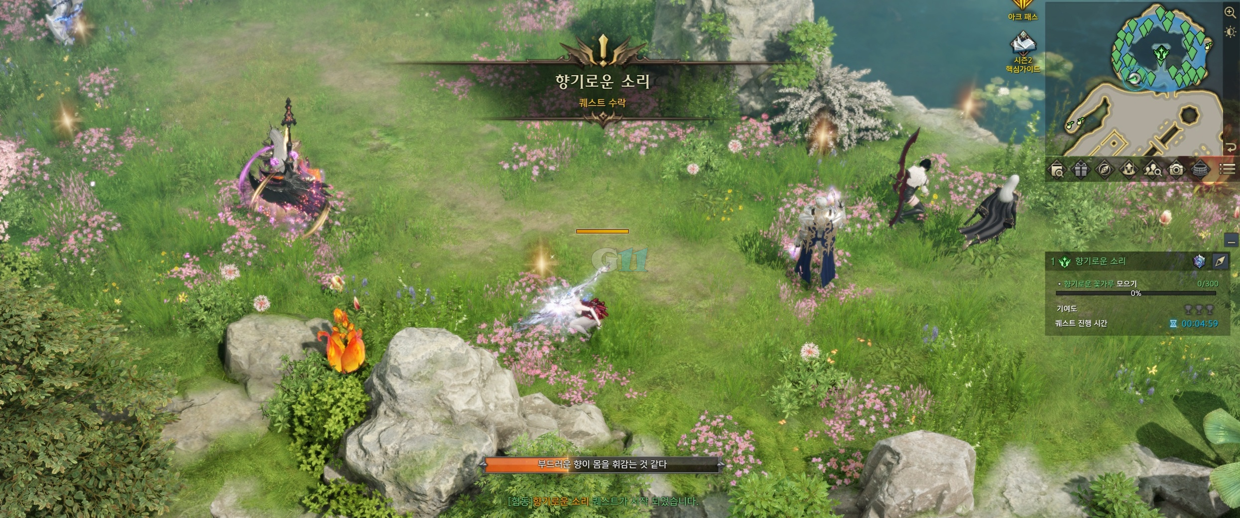 두 번째 협동 퀘스트는 향기로운 꽃가루 수집하기입니다. 12시 방향에서 진행할 수 있으며 원 지형에 위와 같이 꽃이 젠됩니다. 상호작용 키를 이용해 쉽게 진행할 수 있으며 하모니 섬 섬의 마음과 천상의 하모니 악보가 드롭되는 향기로운 소리의 상자를 획득할 수 있습니다.
