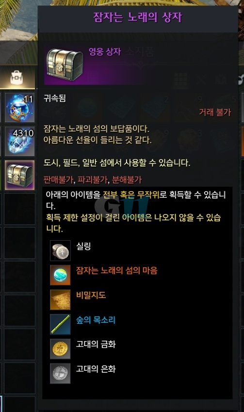잠자는 노래의 섬 퀘스트인 협동 퀘스트를 모두 완료하면 기여도에 따라 잠자는 노래의 상자를 획득할 수 있으며 이 상자를 열면 확률로 잠자는 노래의 섬의 마음, 잠자는 노래의 섬 모험물 비밀지도와 숲의 미뉴에트 퀘스트에 필요한 숲의 목소리를 획득할 수 있습니다. 대부분 비밀지도와 숲의 목소리를 얻기 위해 재방문하는 경우가 많으며 위 3개 아이템을 모두 얻었다면 졸업 가능합니다.