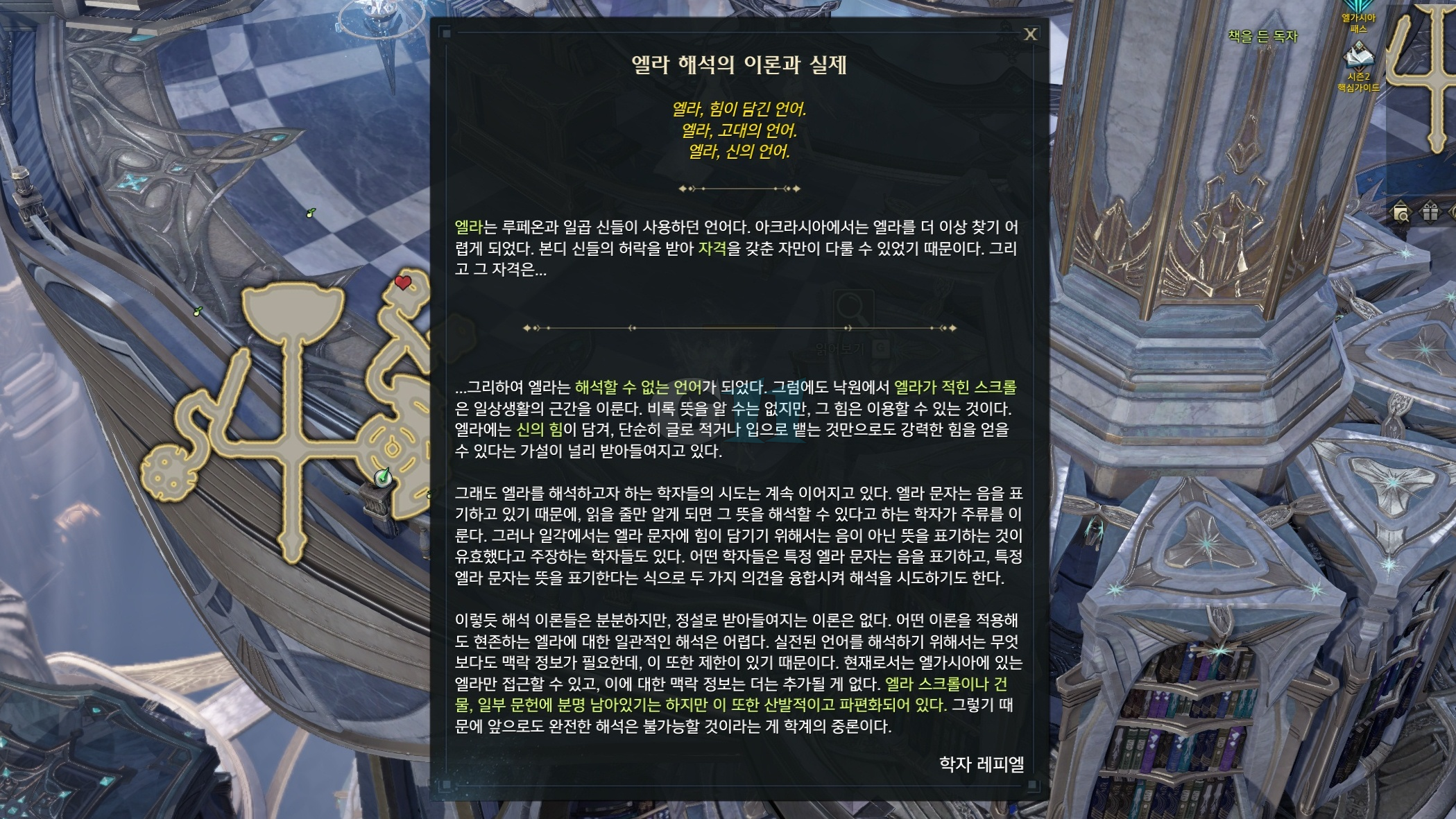 마지막 엘라 해석의 이론과 실체는 도서관 사서 NPC에서 6시 방향 끝으로 걸어가면 됩니다. 위와 같이 기둥에 다가가면 상호작용이 활성화되며 업적을 마무리할 수 있습니다.