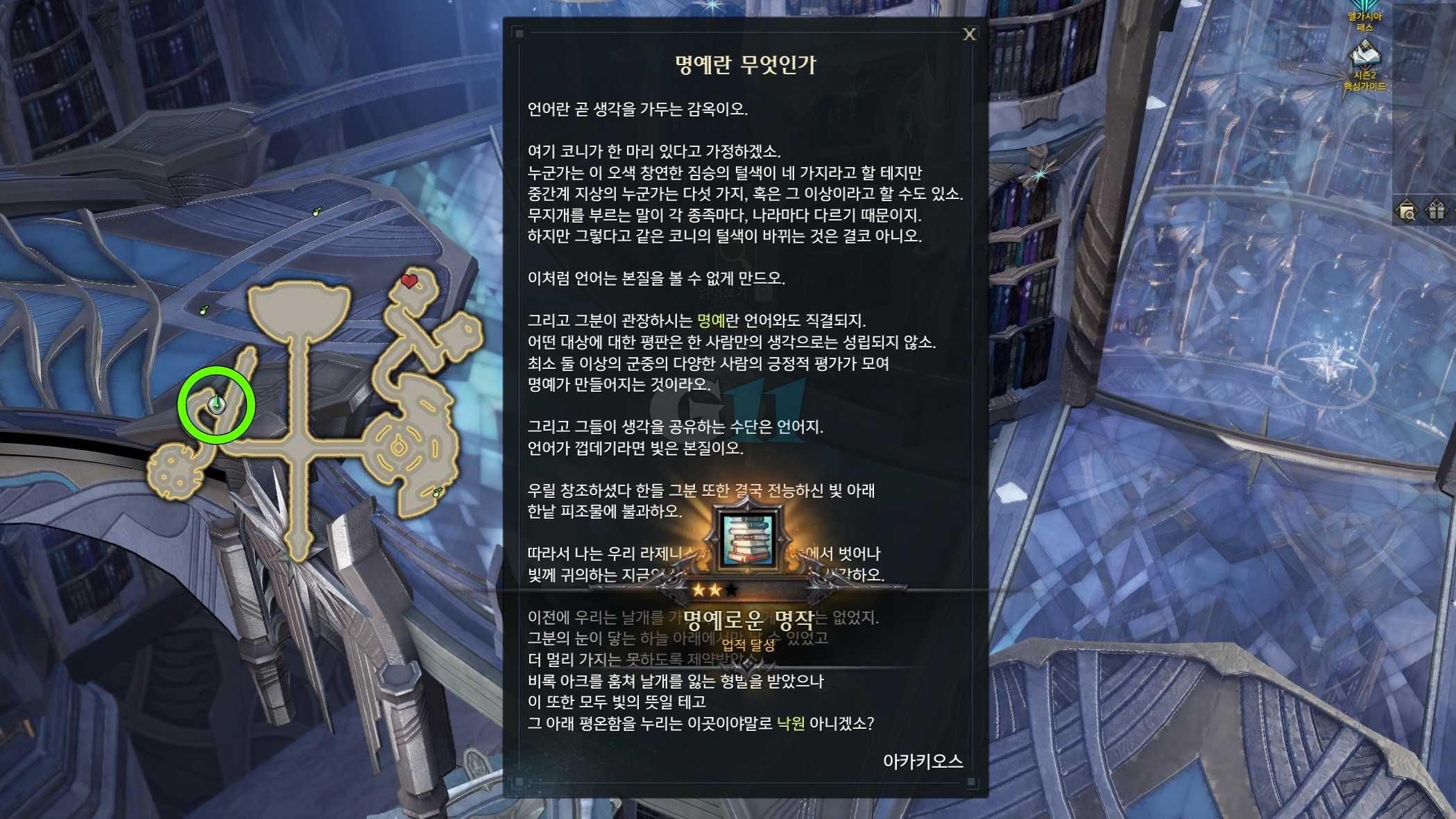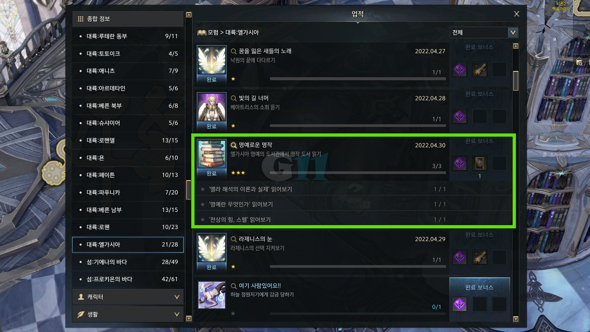 로스트아크 엘가시아 대륙 신규 모험 업적인 명예로운 걸작에 대해 소개합니다. 명예로운 걸작 업적은 명예의 도서관에서 책만 읽으면 완료되는 간단한 업적으로 메인 퀘스트 진행 시 병행해서 하면 동선을 줄일 수 있습니다. 엘라 해석의 이론과 실체 읽어보기, 명예란 무엇인가, 천상의 힘 스펠을 완료하면 명예로운 걸작 업적을 완료할 수 있으며 보상으로 고급 하늘 고래 카드를 얻을 수 있습니다.