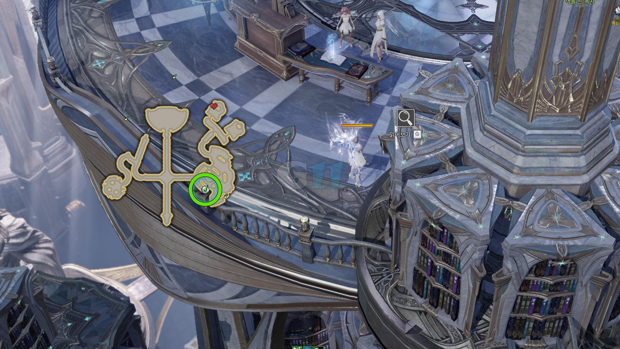 천상의 힘 스펠 책은 사서 NPC 앞에 있으며 책이 여러 권 겹쳐있어 잘 확인해야 합니다. 위 사진과 같이 책 두 권이 가까운 거리에 있어 다가간 다음 아래에 있는 책을 읽으면 됩니다.