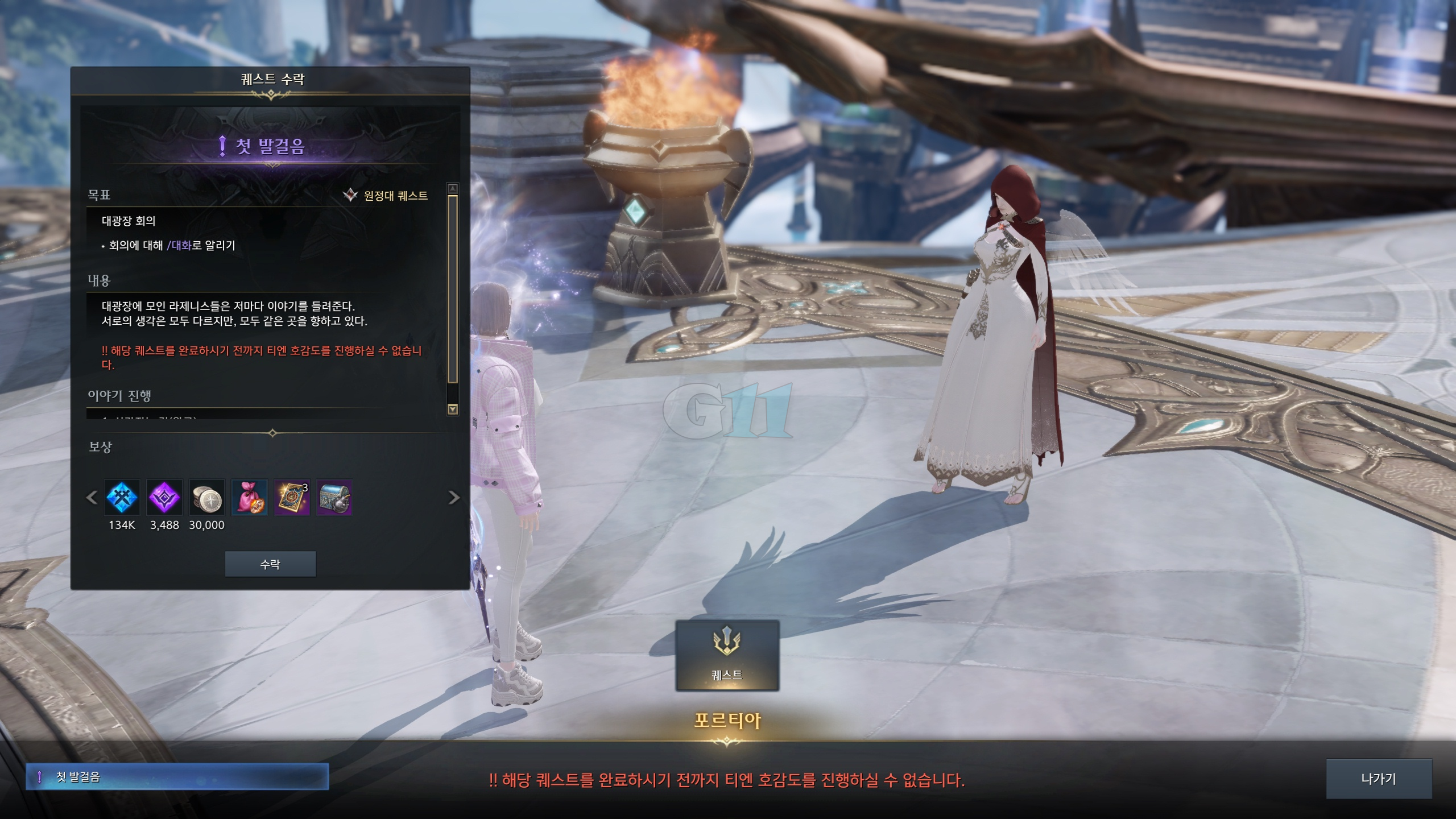 라제니스 대광장 인던에 입장하며 니나브, 아자키엘, 티엔과 대화를 하면 완료됩니다. 마지막으로 자동으로 나와지며 알비온이 기다리는 곳으로 이동해며 지상(속삭이는 작은섬)으로 내려갑니다. 속삭이는 작은 섬의 알비온과 대화를 하면 [첫 발걸음] 퀘스트가 완료되며 니나브를 통해 [광기가 할퀸 땅] 퀘스트를 진행할 수 있습니다.