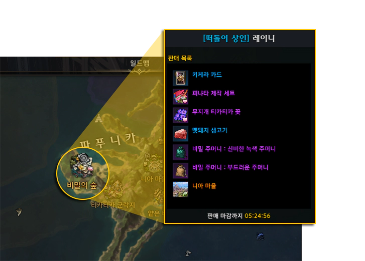 9월 중 업데이트를 통해 서버 환경이 갱신되더라도 떠돌이 상인이 유지되도록 개선될 예정입니다. - 같은 시각에 등장한 떠돌이 상인은 모든 채널에서 동일한 아이템을 판매합니다.