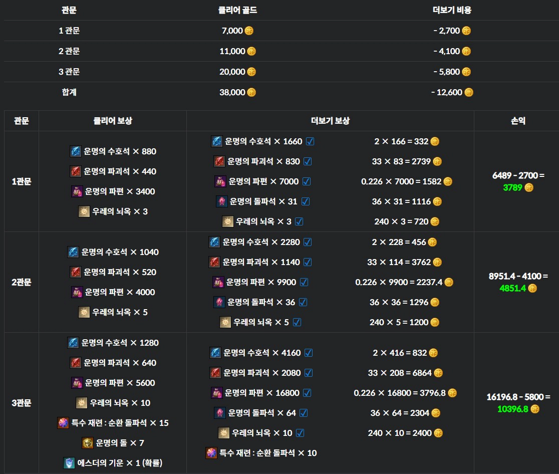 | 모르둠 노말 3관문 | 이득 | 5627.6 | 12,500 | 4,200 | 1427.6 |