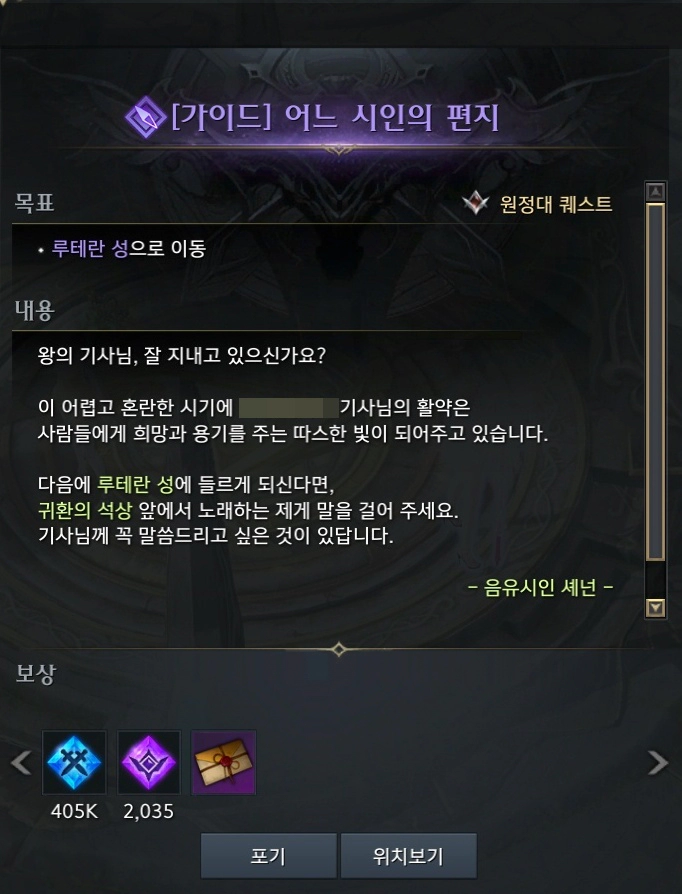 루테란 성 귀환의 석상 앞에 있는 음유시인 셰넌과 짧게 대화를 완료하면 어느 시인의 편지 퀘스트가 완료됩니다. 보상으로 어느 시인의 편지를 받을 수 있으며 퀘스트 진행을 위해 셰넌에게 다가가서 상호작용을 합니다. 퀘스트는 히든 퀘스트로 변하기에 다가가서 상호작용을 해야만합니다.