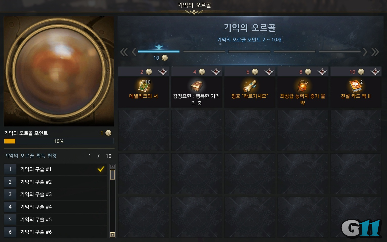 기억의 오르골 수집 보상으로 메넬리크의 서, 행복한 기억의 춤 감정표현, 칭호 라르기시모, 최상급 능력치 증가 물약과 마지막으로 전설 카드팩 2장을 얻을 수 있습니다.