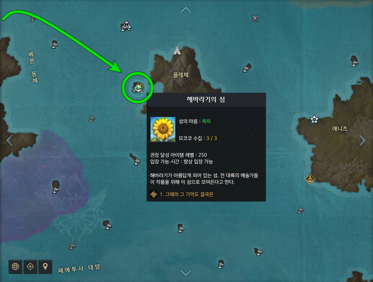 '그때의 그 기억도 결국은' 퀘스트는 '그림자처럼 따라붙는' 퀘스트를 완료하고 얻은 보상인 '해바라기 섬 사진'을 하루뒤에 사용하면 시작할 수 있습니다. 퀘스트 진행을 위해 해바라기 섬으로 이동해야하며 해바라기 섬은 베른 북부에서 출항해 이동하면 가깝습니다. 해바라기 섬 관련 공략은 아래 포스팅을 참고하세요.