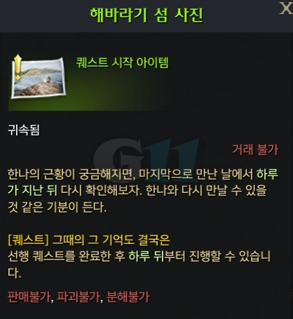 섬 입구에 있는 한나와 대화를하고 섬 내에서 퀘스트를 진행하면 5분 정도 소요되며 보상으로 해바라기 섬 사진을 얻을 수 있습니다. 해바라기 섬 사진을 얻고 하루 뒤에 '그때는 그 기억도 결국은' 퀘스트를 진행할 수 있습니다.