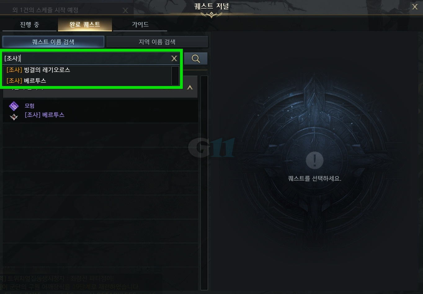 먼저 위 퀘스트 순서를 확인하고 퀘스트(J) 단축키를 눌러 퀘스트 창을 열어봅니다. 다음으로 상단 완료 퀘스트를 누르고 [조사]를 검색하면 위와 같이 퀘스트가 나타납니다. 저의 경우 빙결의 레기오로스와 베르투스까지 완료되어 있으므로 2번까지 완료된 상태입니다. 하지만 3번 크로마니움부터는 메마른 절규의 땅에 방문한 적이 없어 퀘스트가 보이지 않는 상태가 됩니다. 그러니 대항해에서 메마른 절규의 땅을 검색하고 방문하면 됩니다.