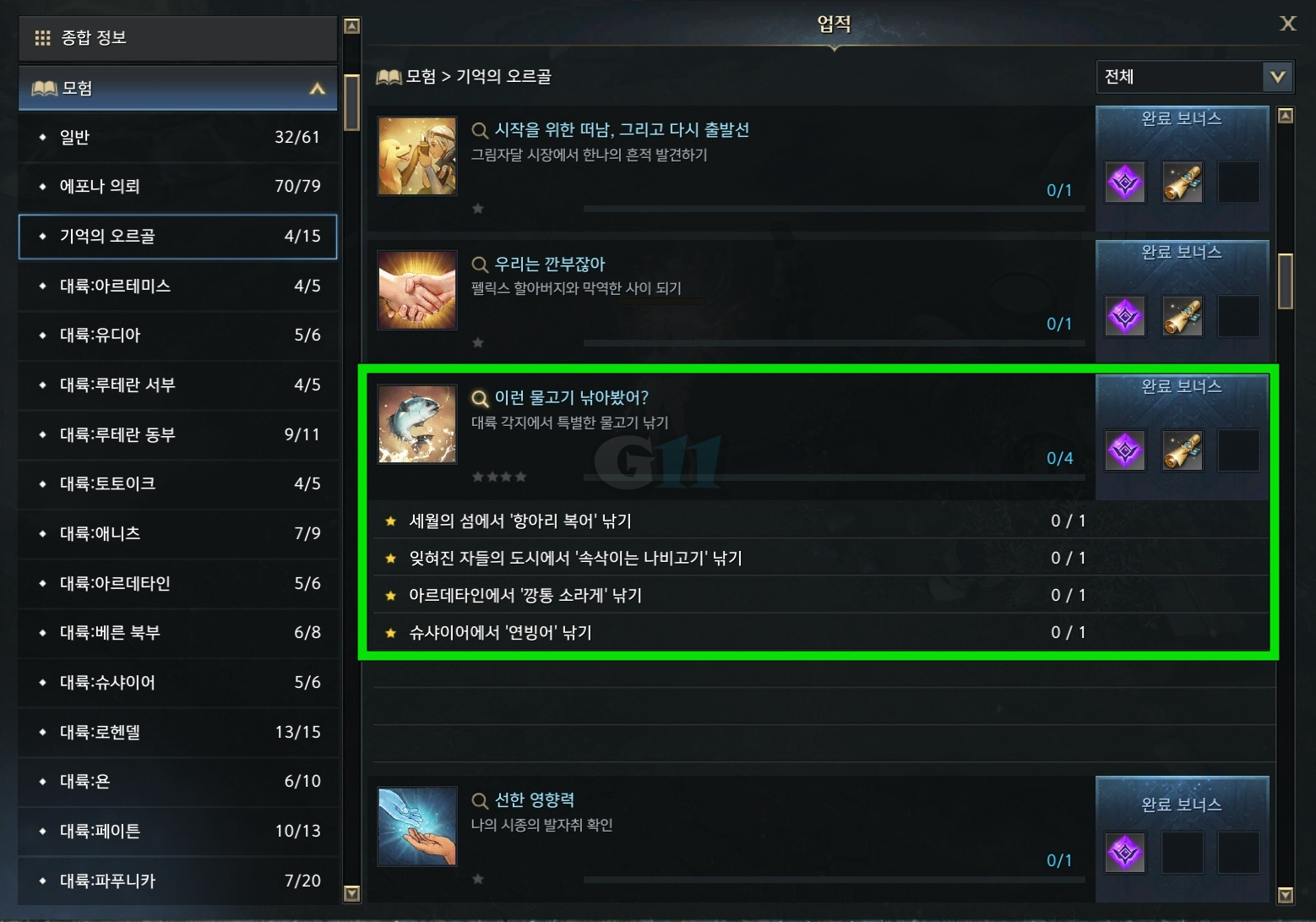 [업적] → [모험] → [기억의 오르골] → [이런 물고기 낚아봤어?]를 보면 업적 리스트가 나열되어 있습니다. 첫 번째 단서의 업적을 완료하려면 업적 1단계를 완료해야합니다. 각 물고기를 1마리씩 낚아주시면 됩니다. 아래 물고기들은 잘 안 나오는 편이니 이벤트로 모아둔 생명의 기운 회복 물약과 도약의 정수를 적절히 사용하면서 모으시면 됩니다.