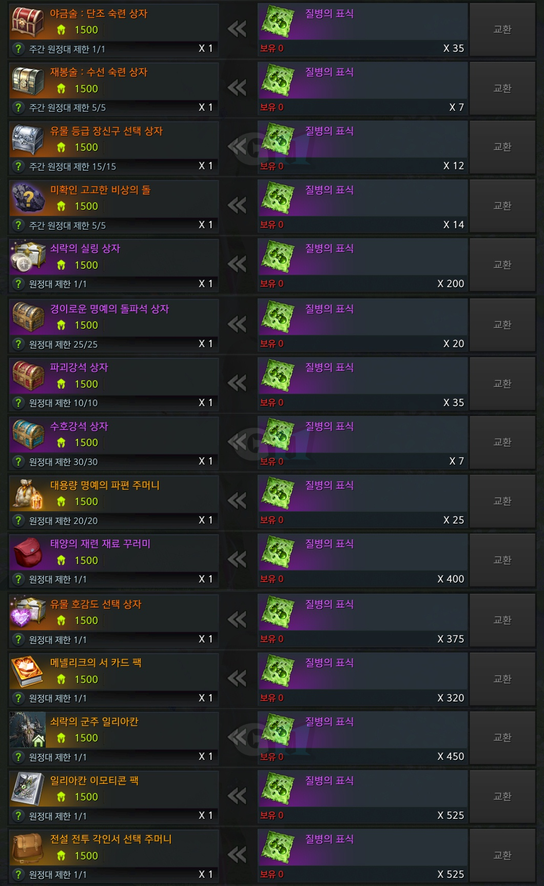 | 아이템 | 교환 횟수 | 질병의 표식 갯수 |