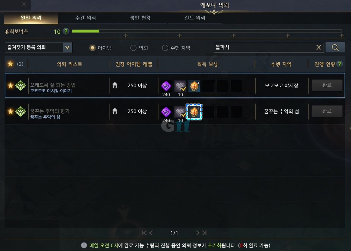 에포나 의뢰는 일일 에포나 의뢰와 주간 에포나 의뢰가 있으며 매일 다양한 재료를 얻을 수 있어 매일 꾸준히 진행하는 숙제 컨텐츠 중 하나입니다. 그 중 자신이 필요한 재료에 맞춰 진행하며 보통 에포나 3종으로 명예의 돌파석 위명돌을 주는 에포나를 많이 진행합니다.