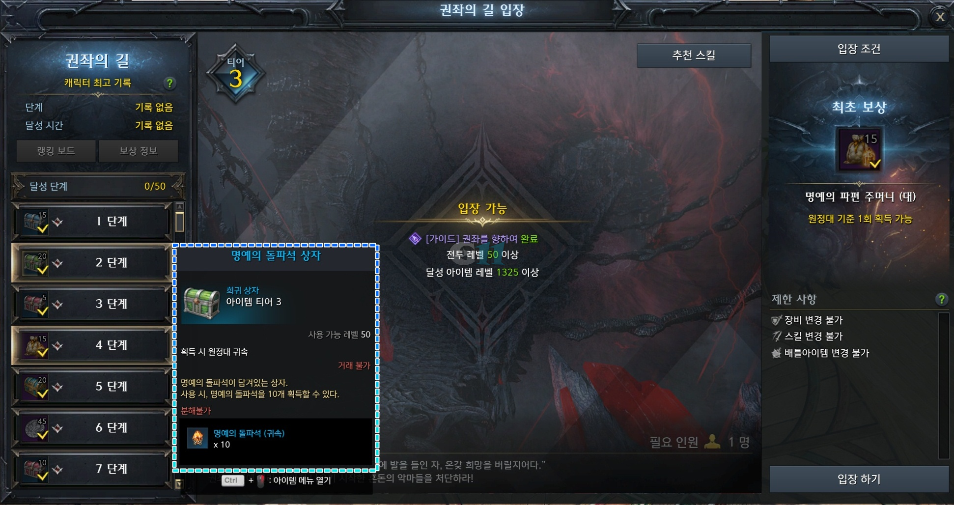 권좌의 길 해당 층 이상 클리어 시 돌파석 상자를 얻을 수 있습니다. 2단계 클리어 시 명예의 돌파석 200개, 12단계 돌파 시 위대한 명예의 돌파석 50개, 18층 돌파 시 위대한 명예의 돌파석 100개, 23단계 돌파 시 위대한 명예의 돌파석 60개를 얻을 수 있으며 원정대 1회 제한입니다.